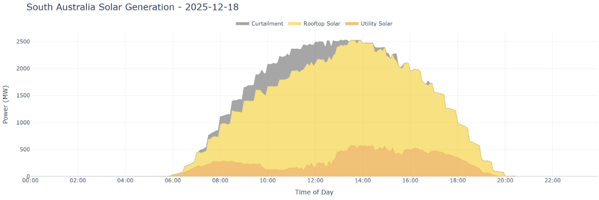 At 1:30 pm on 18 December, solar output in South Australia reached an instantaneous peak of 2,524 MW. To put this into perspective, the state’s average electricity consumption across December was around 1,742 MW – meaning the solar peak alone was roughly 70% higher than typical demand.