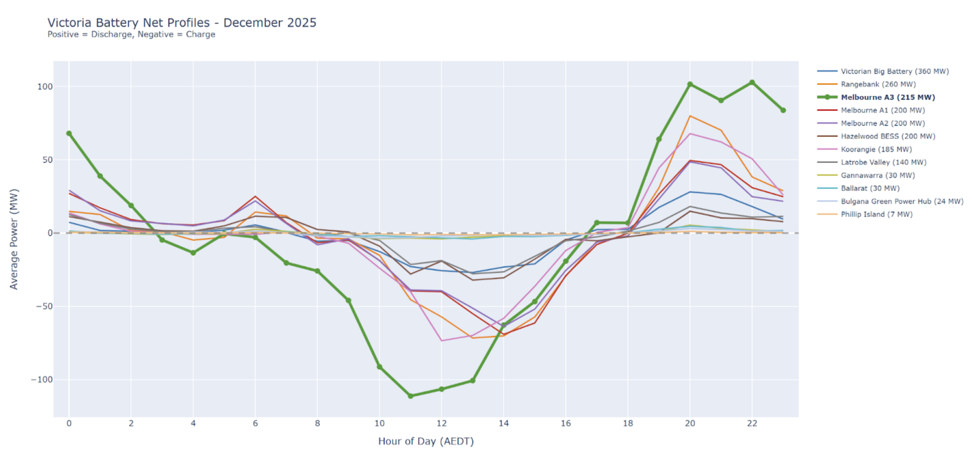 These longer-duration batteries were among the largest contributors to the monthly discharge record and show a distinct operating pattern, continuing to discharge later into the evening than the two-hour systems that currently dominate the market.