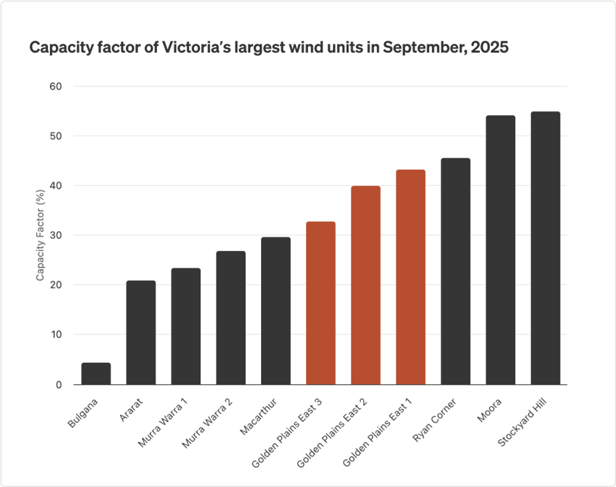 Both solar and wind generation were strong, with growth of 24% and 21% year-on-year respectively. The largest contributor was the Golden Plains Wind Farm, which contributed just 37MWh in September 2024 and 209,732MWh in September 2025 – more than any Australian wind farm has previously generated in a month. This gives a capacity factor of over 38% for the month. This is a particularly impressive performance from Golden Plains Unit 3 considering it’s still commissioning.