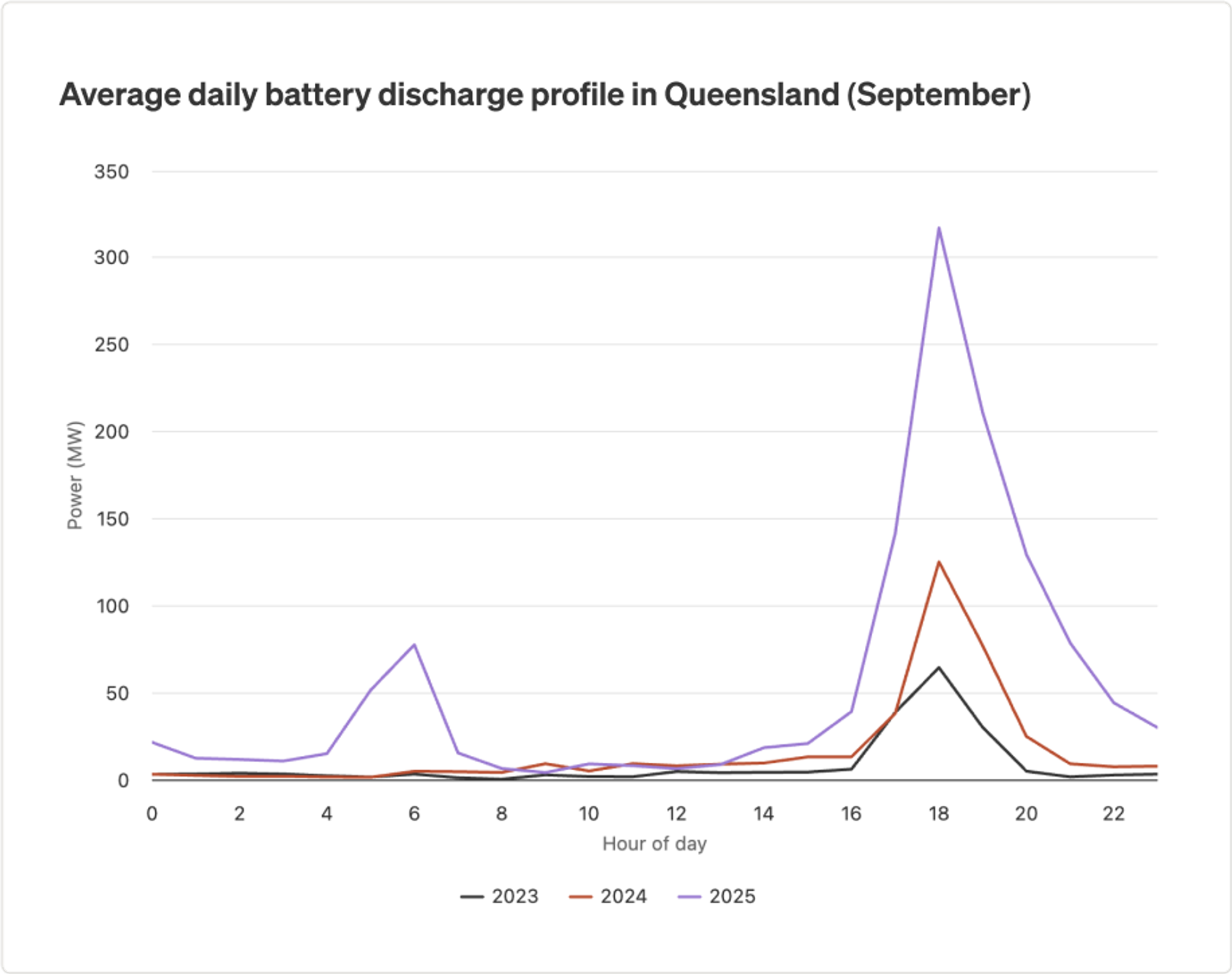While no new hydro has been added in recent years – the Kidston pumped hydro project remains under construction – existing assets are being utilised differently. Notably, Wivenhoe, a pumped hydro facility, is pumping more during the day, allowing for greater evening generation. This shift enables hydro to complement batteries in displacing gas during the evening peak. This September, we saw greater use of the Queensland pumps than ever before.