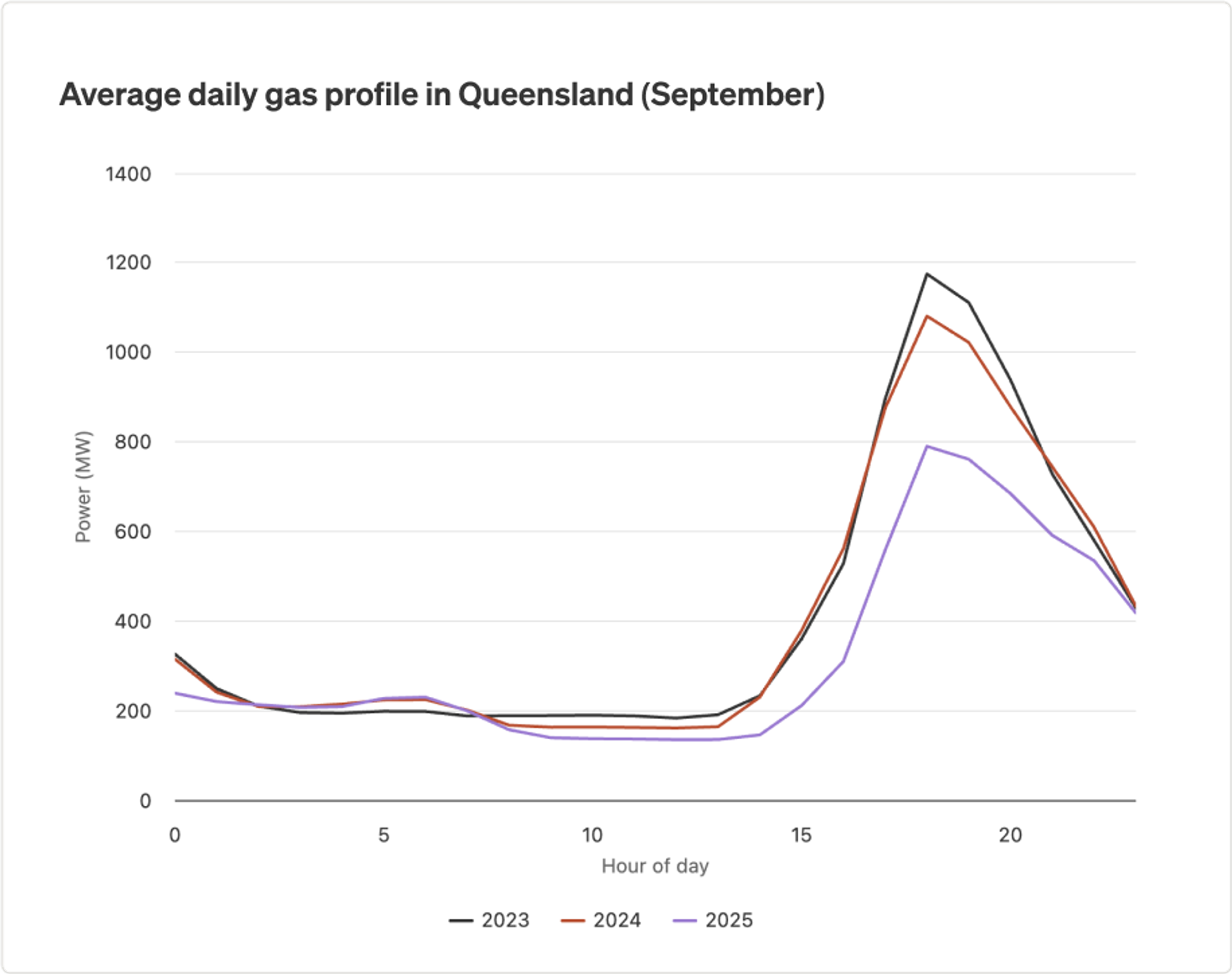 Analysis of hourly generation data shows that nearly all of the decline in Queensland’s gas generation occurred during the evening peak – a strong signal that other technologies are beginning to displace gas at critical times.