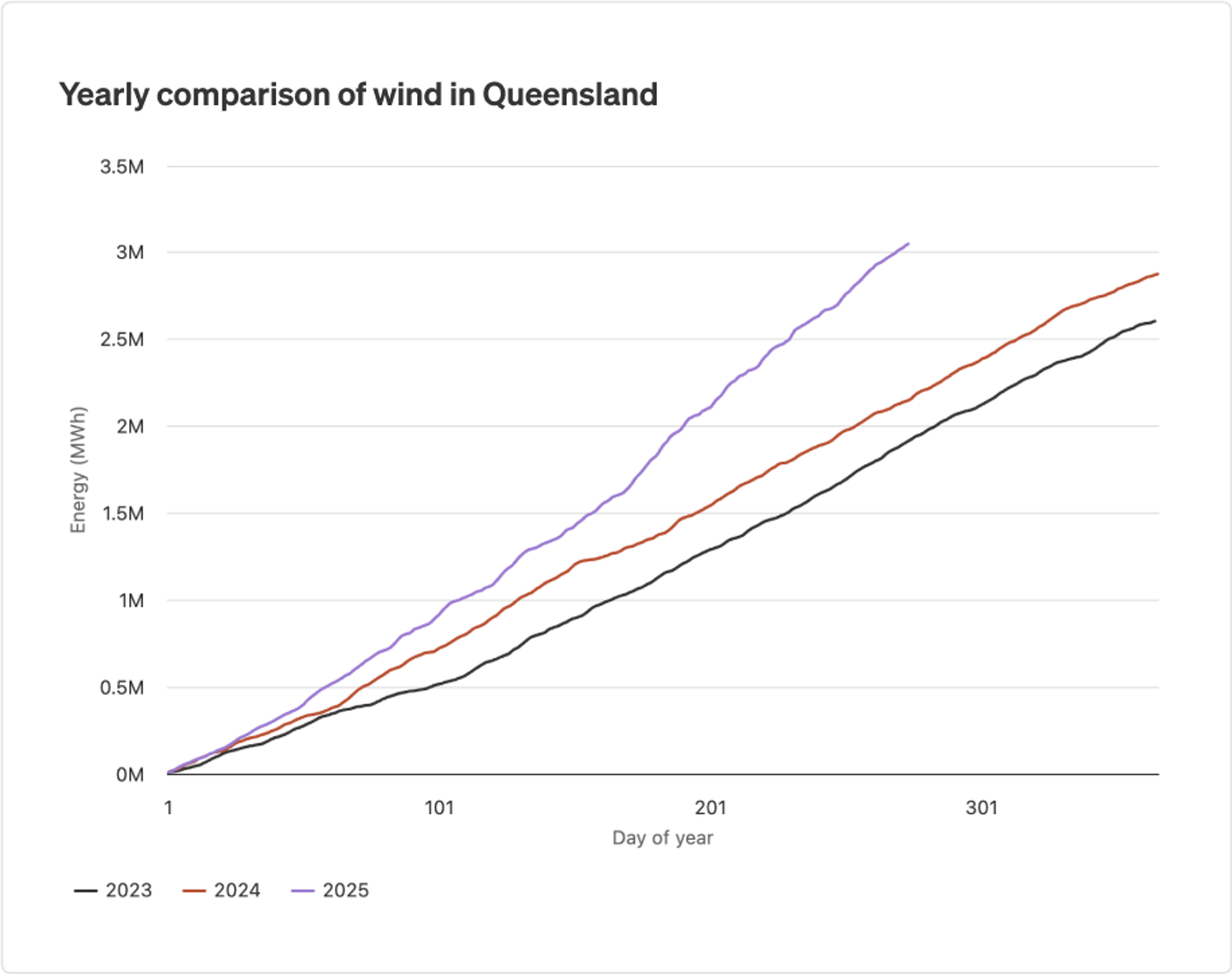 Together, these projects represent over 60% of Queensland’s registered wind capacity. While they are not yet fully commissioned, they have already delivered a dramatic increase in cumulative wind output in the state. On 16 September, Queensland surpassed its yearly wind generation record, overcoming the 2024 total of 2,877GWh.