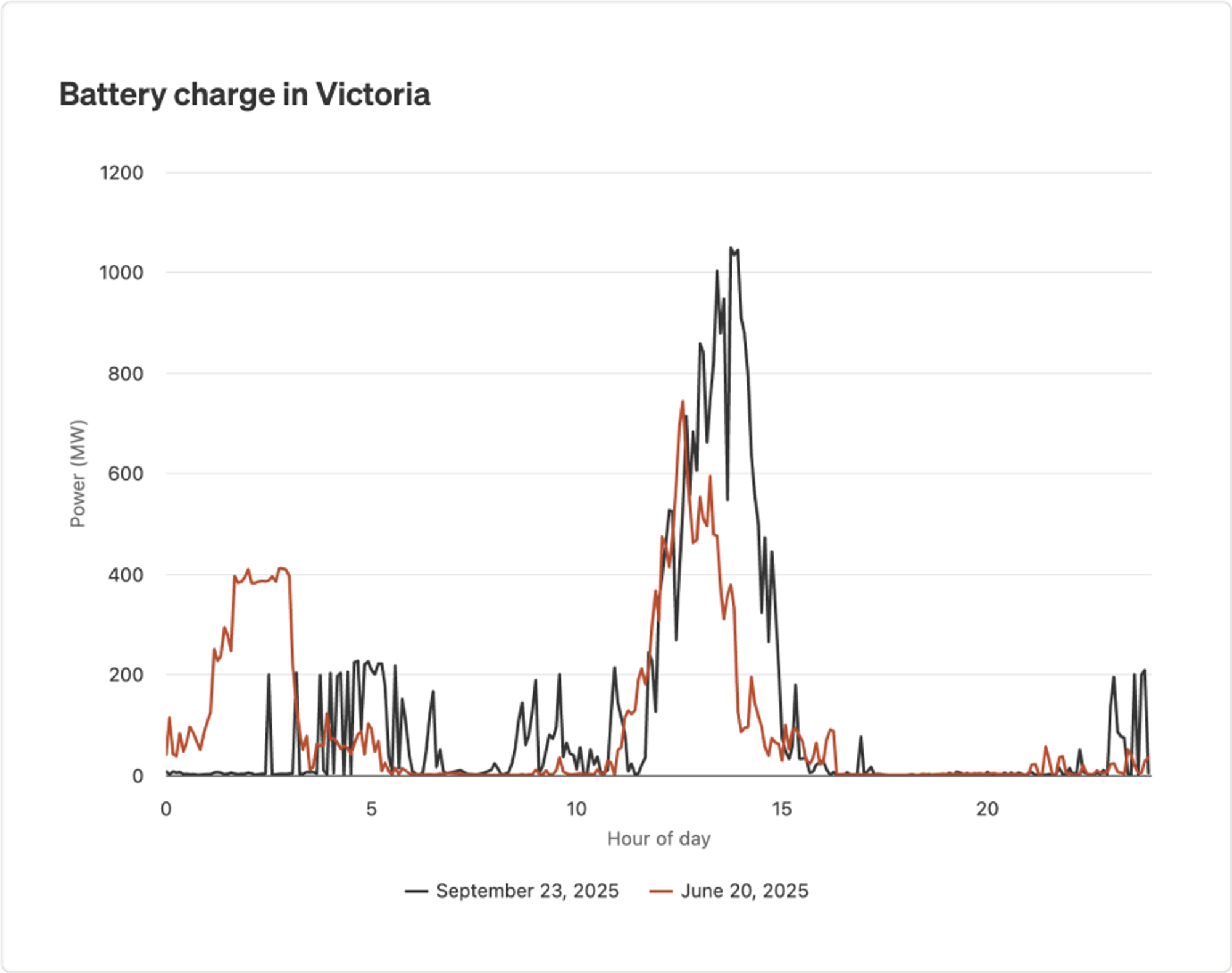 Victoria saw its highest instantaneous charging record – 1049MW – at 1:45PM on 23 September. Prior to this month, the record stood at 744MW, recorded on 20 June, and makes Victoria the first state to cross the gigawatt threshold for battery charging.